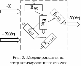 Спец языки написаны на универсальных языках. Динамика системы отображается взаимодействием элементов модели Е1,...,Еn во времени и пространстве.