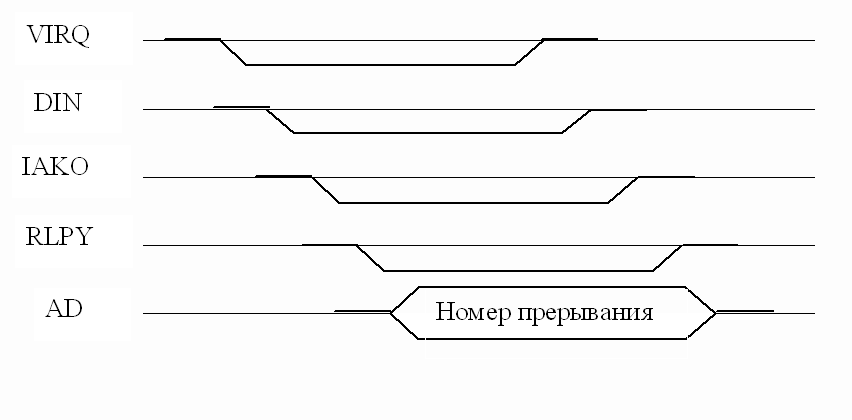 Получив сигнал IAKO, внешнее устройство выставляет сигнал RPLY (сигнал ответа) на одной из линий шины. Сигнал RPLY говорит, что на шине данных появились некоторые данные (номер прерывания). Процессор читает код номера прерывания. Когда чтение заканчивается, сигналы DIN и IAKO снимаются. Снятие сигналов DIN и IAKO говорит внешнему устройству, что информация шины данных получена, и шину можно освободить. При этом, если несколько устройств требуют прерывания, то сигнал VIRQ остаётся. Он снимется, когда будет обработано последнее прерывание.