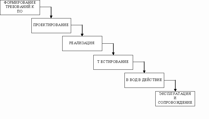 Каскадная модель подразумевает ступенчатое выполнение стадий ЖЦ, следующая стадия наступает после полного завершения предыдущей стадии рис. 3.